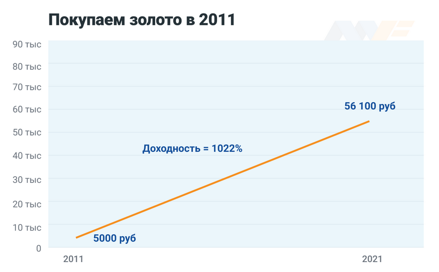 Еще одна «вечная ценность» в глазах обывателя. Однако практика показывает, что цены на золото могут выделывать фигуры падения не хуже нефтяных котировок. Если мы в 2011 купим на все сбережения золото по цене $1400 за унцию, то в 2021 году сможем продать наш запас уже по $1900, получив в итоге $22 500. Таким образом первоначальные 5000 рублей превратятся в 56,1 тыс. руб.