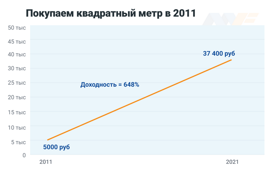 Недвижимость – вечная ценность. По крайней мере в этом уверена значительная часть покупателей бетонометров в Минске. В 2011 году на имеющиеся $16,6 тыс в эквиваленте можно было приобрести 12,3 кв.м. жилья в Минске, исходя из средней цены в $1350 за квадрат. Спустя 10 лет цена квадратного метра просядет до $1220. А значит наши метры можно будет превратить только в $15 тыс. Сомнительная инвестиция принесет потери минус 9,6% в валюте. А если считать в рублях, то отложенные 5000 рублей превратятся в 37,4 тыс руб. Доходность составит 648% за 10 лет, а с учетом инфляции – 216%.