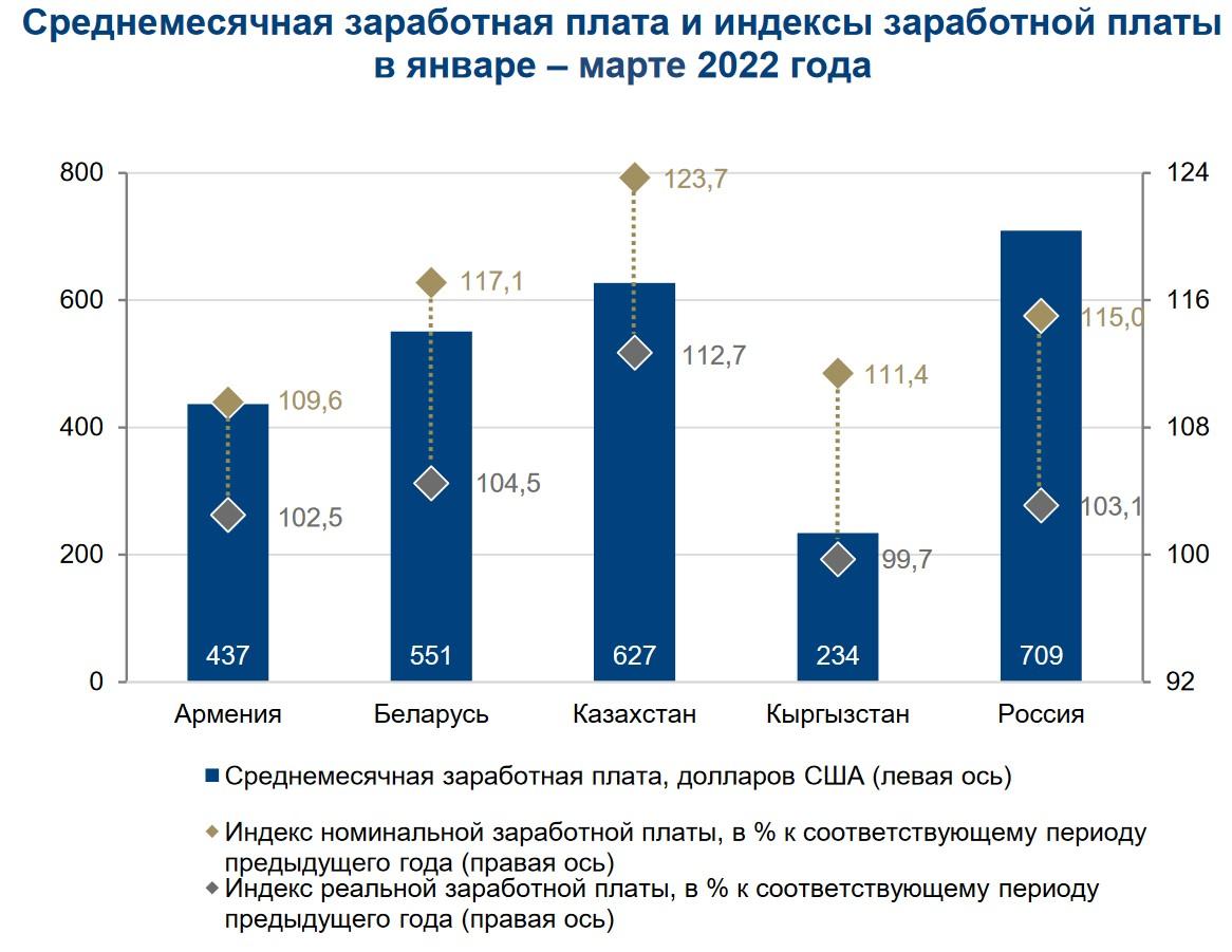 Средняя зарплата в странах в январе-марте выросла в странах ЕАЭС и самые высокие темпы роста зафиксированы в Казахстане и в Беларуси.