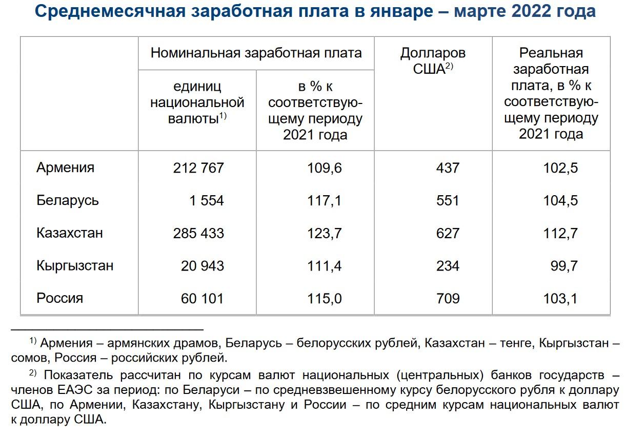 Как сообщили в Евразийской экономической комиссии, среднемесячная номинальная заработная плата в первом квартале 2022 года по сравнению с аналогичным периодом 2021 года увеличилась во всех странах Евразийского экономического союза.