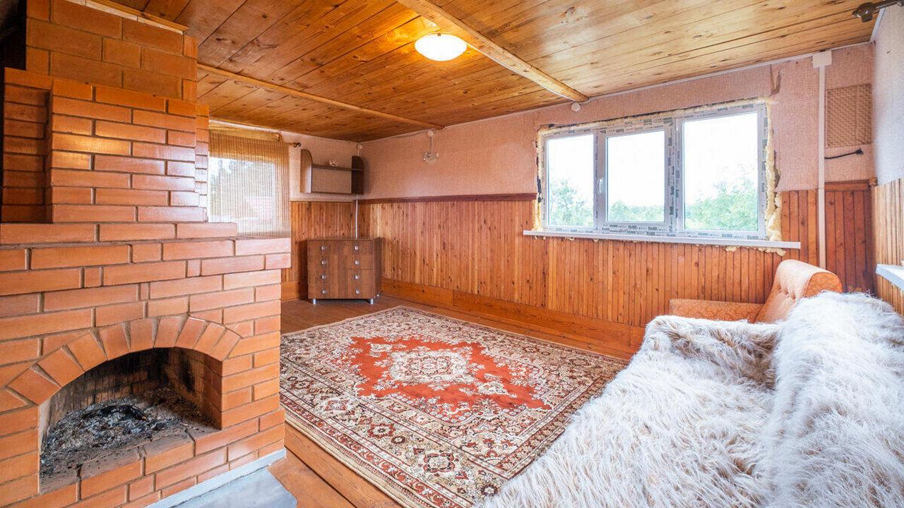 То же садовое товарищество, те же плюсы (наличие озера) и минусы (плохое транспортное сообщение). Но здесь дом внутри выглядит совершенно иначе, он облицован вагонкой, установлены стеклопакеты, металлическая дверь, камин на втором этаже и печь на первом.