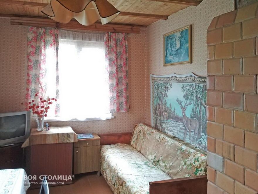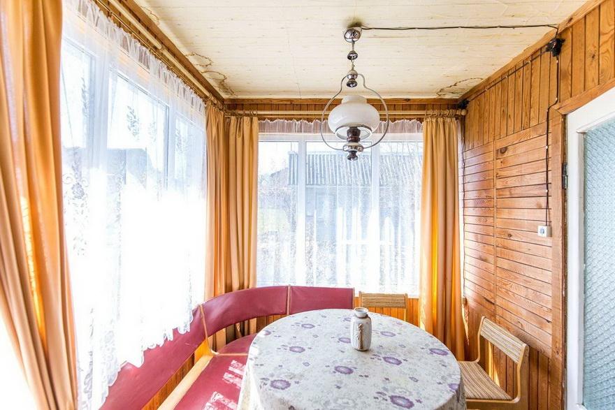 Деревянный дом, который выглядит как самая типичная дача. Изнутри облицован лакированной вагонкой, а на улице построена теплица, растут тюльпаны и садовые деревья. Внутрь проведено электричество, есть сезонная вода, газ из баллонов и печное отопление. Можно провести центральное водоснабжение. Кроме дома, на участке в 4 сотки умещается баня, летняя кухня и сарай.