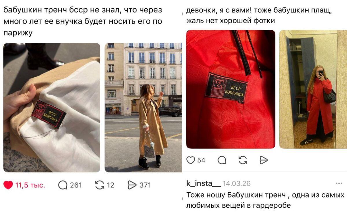 Более практичные вещи также имеются. Представлены десятки тренчей, которые не первую весну заявляют о своей актуальности. Прикупить можно бежевый от Mango за 50 рублей и эксклюзивный вариант времен БССР от бобруйской фабрики за 45 рублей. Именно такой плащ недавно наделал много шума в сети. Белоруски стали массово сообщать, что стильная вещь перекочевала в их гардероб от бабушки, а фотографии из путешествий в культовом тренче с биркой «Бобруйск» собрали тысячи лайков.