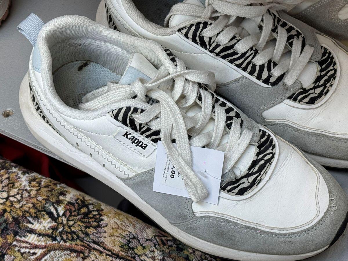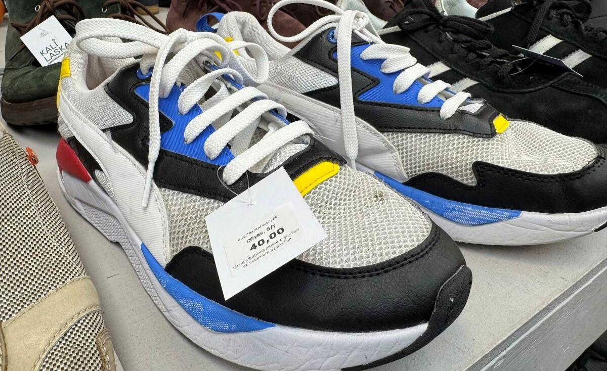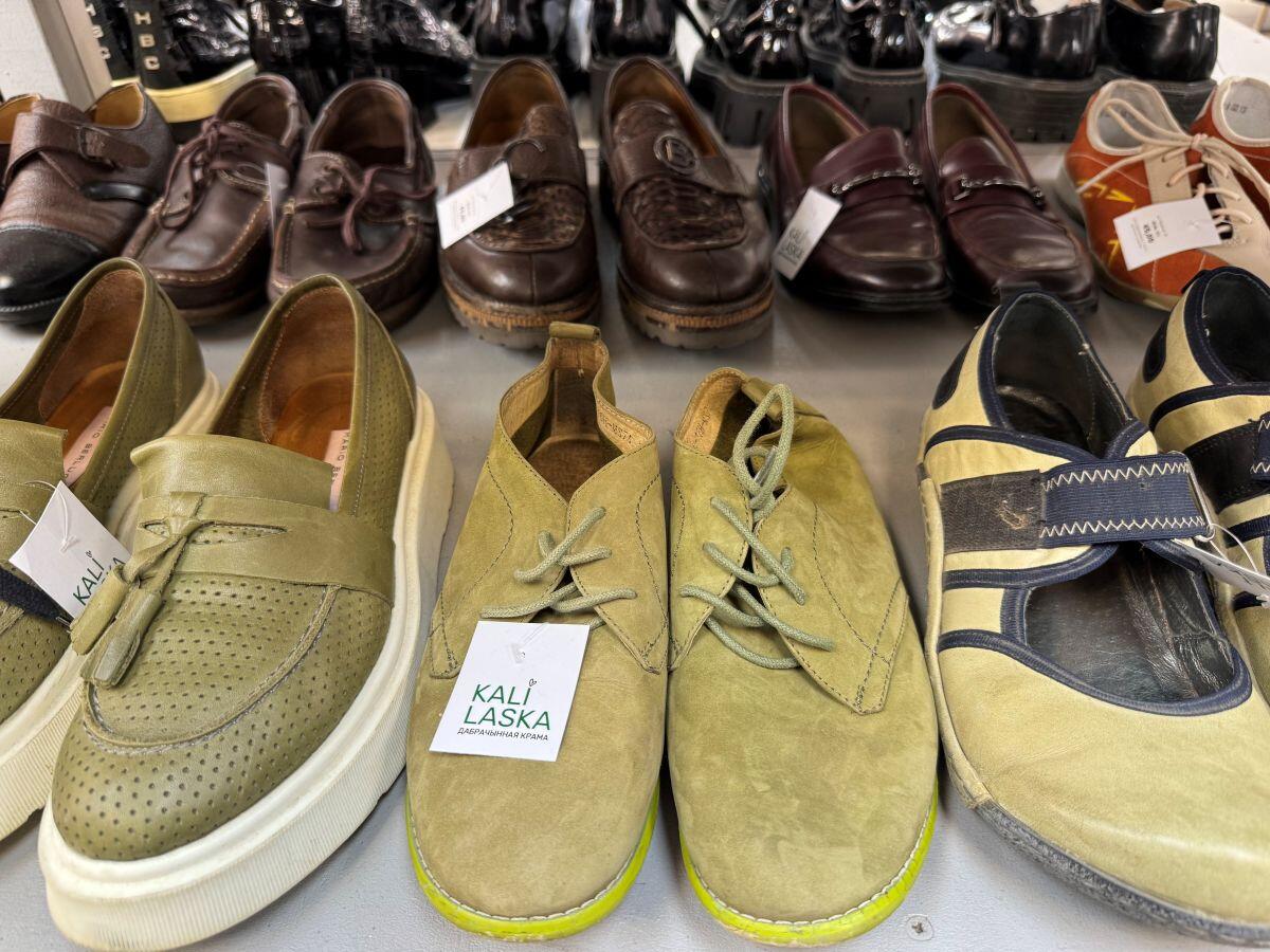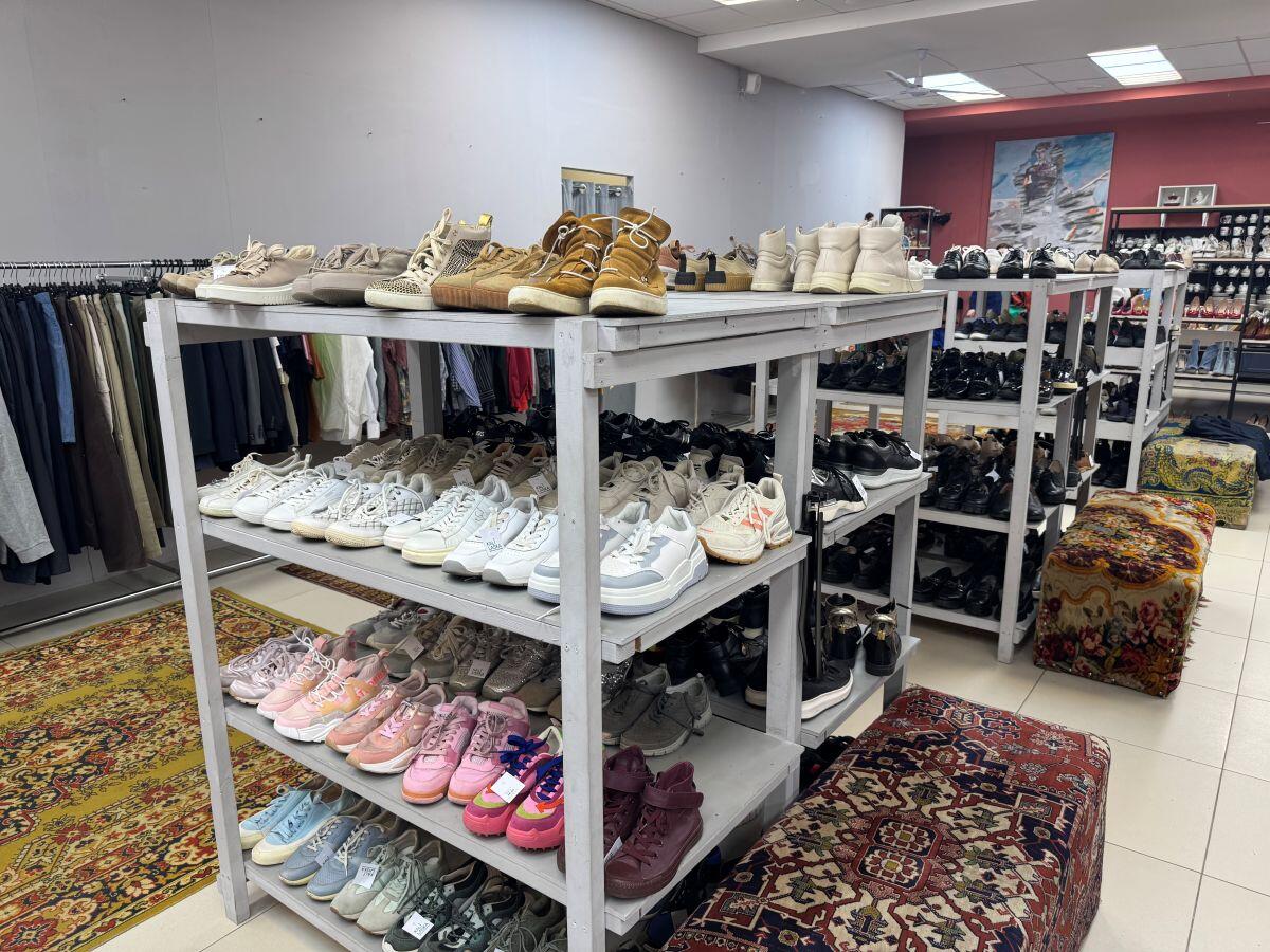 На полках с обувью взгляд сразу же цепляется за кроссовки. Здесь можно найти почти все существующие спортивные бренды, при этом обувь представлена как в черном цвете, так и в ярких оттенках. Пару женских Nike оценили всего в 40 рублей. Мужские модели не дороже 50 рублей. В числе нюансов – затяжки на тканевых элементах, разная степень изношенности и чистоты обуви. Также представлены вечерние варианты: туфли и босоножки от 25 рублей. По большей части покупателям доступны современные модели по заманчивым ценам.