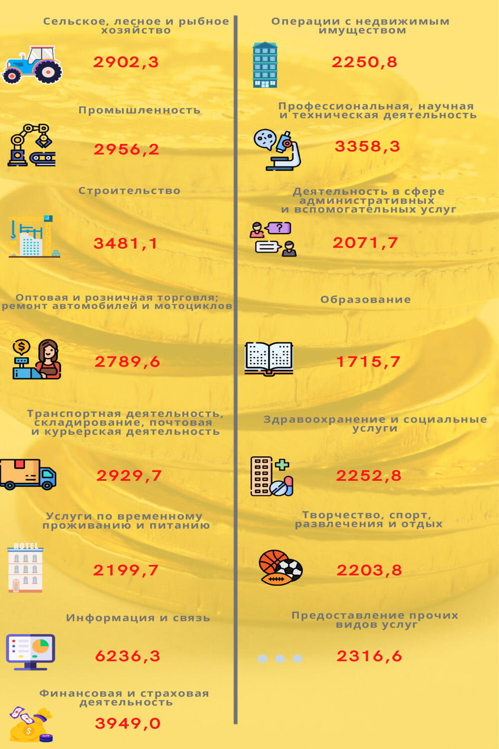 Сфера «Информация и связь» занимает лидирующую позицию среди видов экономической деятельности. Средняя зарплата здесь составила 6236,3 руб.