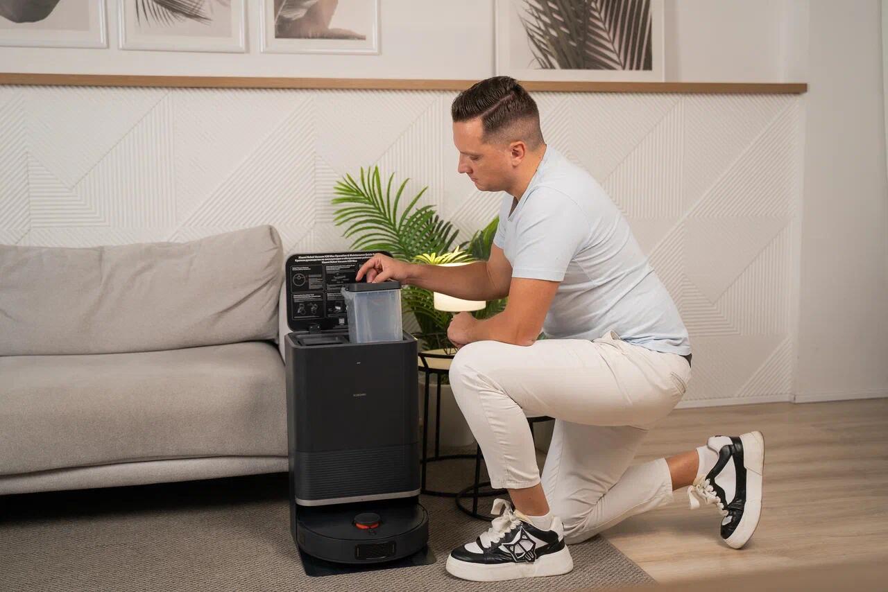 Докстанция здесь непростая, а умная и самостоятельная. Благодаря технологии автоматического сбора пыли и большому пылесборнику на 2,5 литра пылесос можно обслуживать раз в 75 дней. Однако стоит учитывать, что нужно пополнять чистую воду и сливать грязную – с какой периодичностью зависит от частоты уборки.