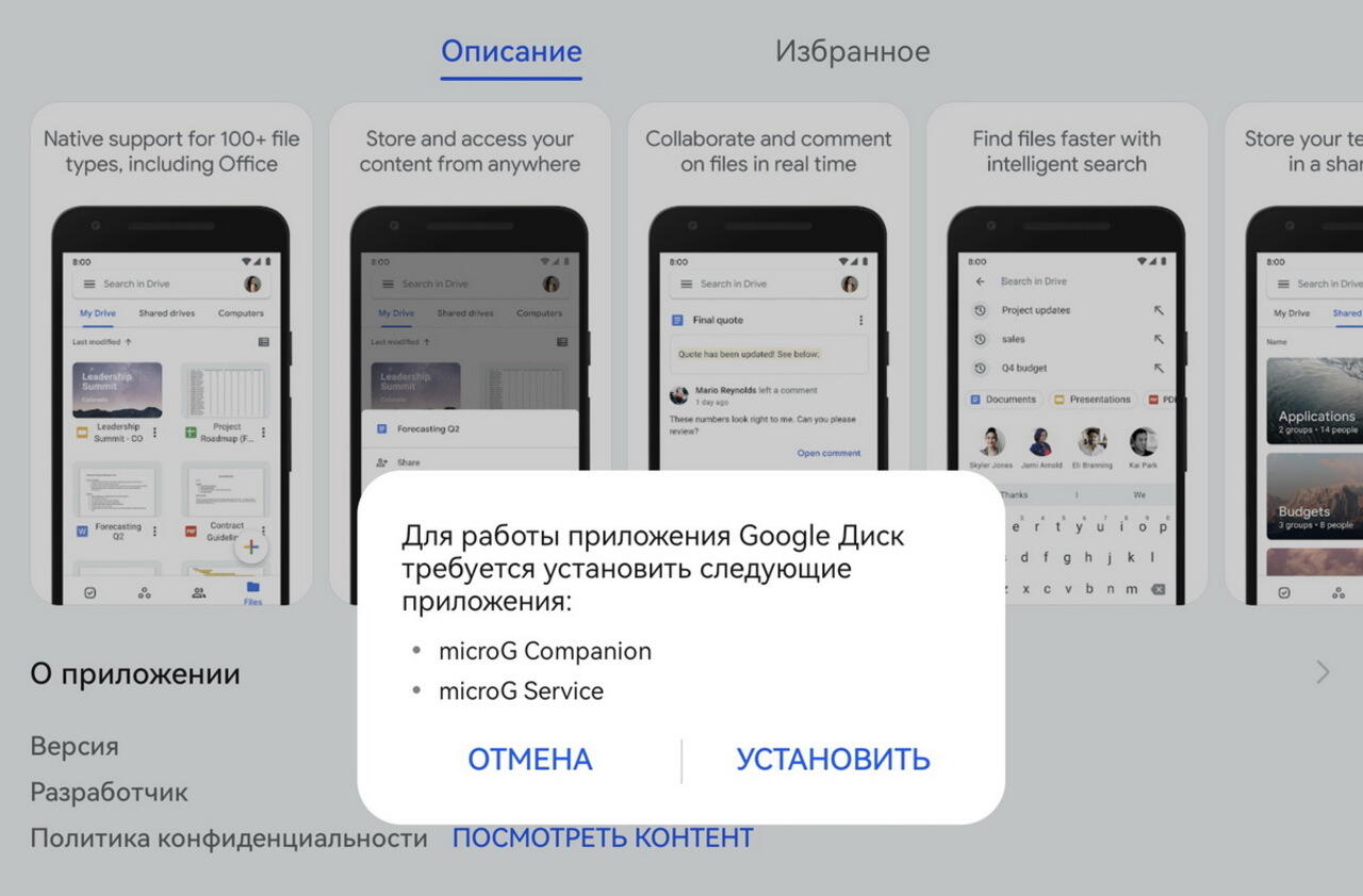 Google Диск скачиваем через AppLake (ЭппЛейк). Поскольку в нашем случае это первое совместимое с microG (микроДжи) приложение, которое мы скачиваем, то появляется уведомление о необходимости установить два файла: microG Companion (микроДжи Компаньон) и microG Services (микроДжи Сервисы). Далее остаётся лишь разрешить доступ к геоданным (чтобы работали Google-карты, например) и зайти в свой Google-аккаунт.