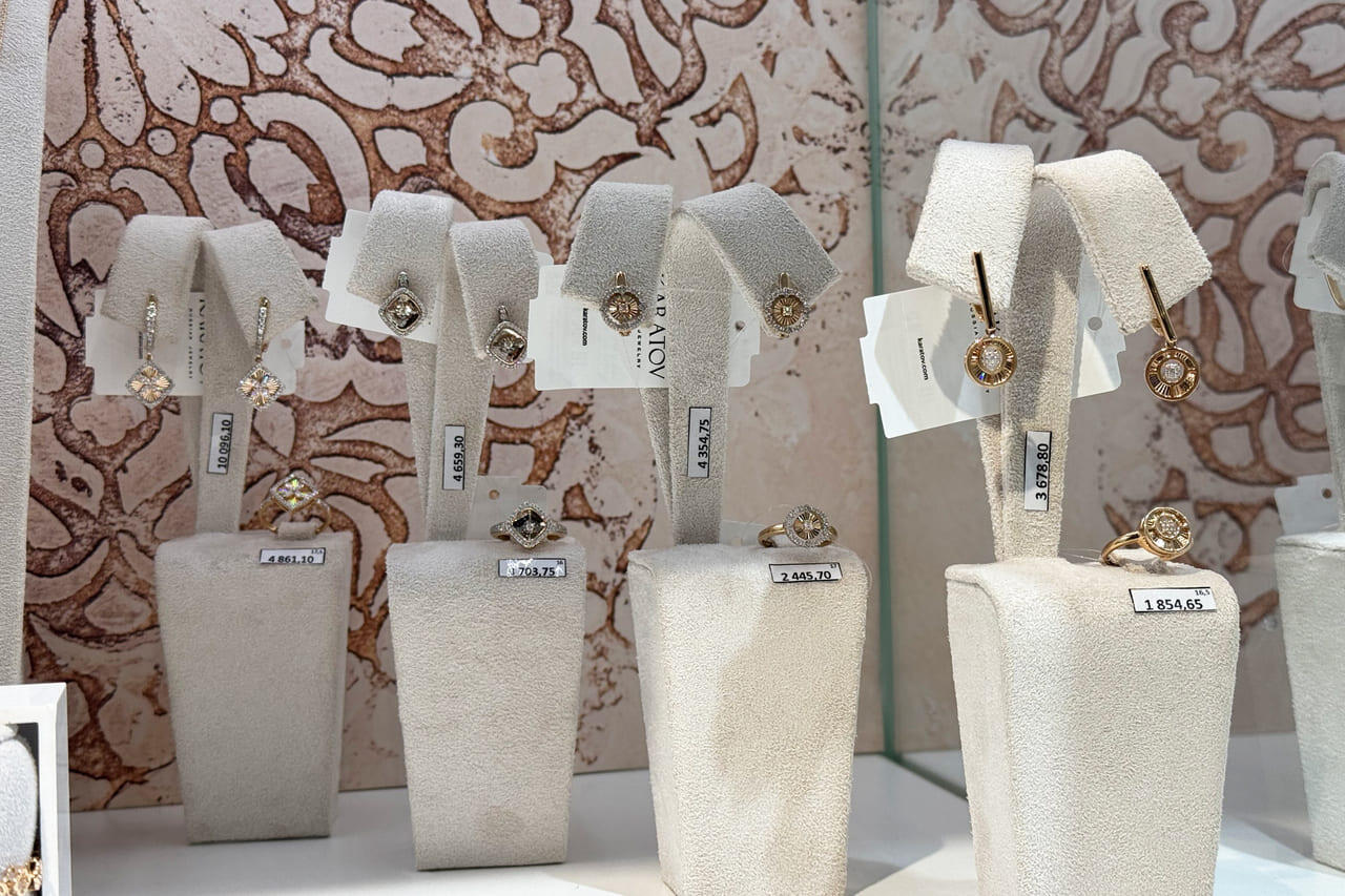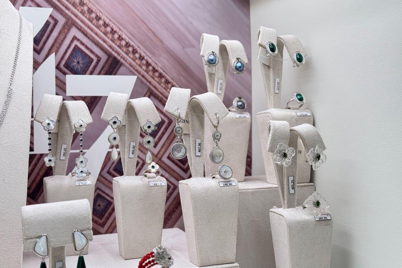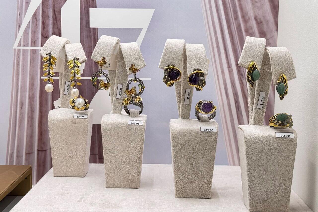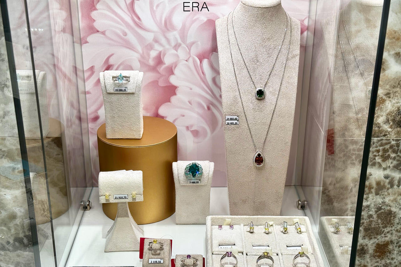 Еще один производитель – ERA JEWELLERY, представленный на выставке в ТЦ Dana Mall, делает акцент на редкие самоцветы, а именно на изделия с турмалином – камнем, находящимся на пике ювелирной популярности в 2025 году. Особое внимание на выставке заслуживают кольца с природным турмалином «Параиба» зеленовато-голубого оттенка и колье с красным турмалином огранки «груша» и массой более 6,7 карата. Это действительно редкие модели украшений для ювелирного рынка Беларуси.