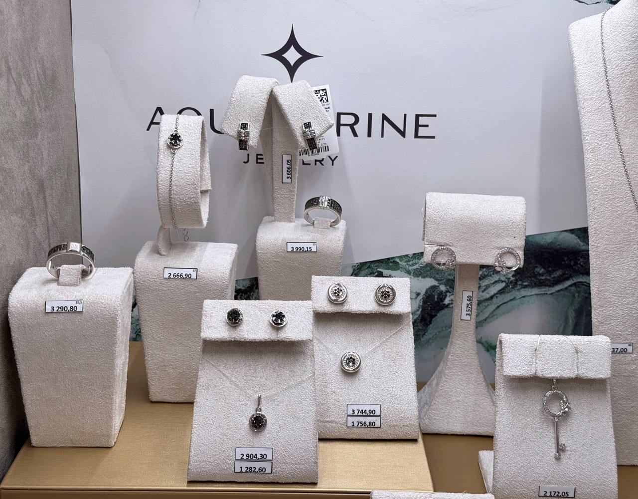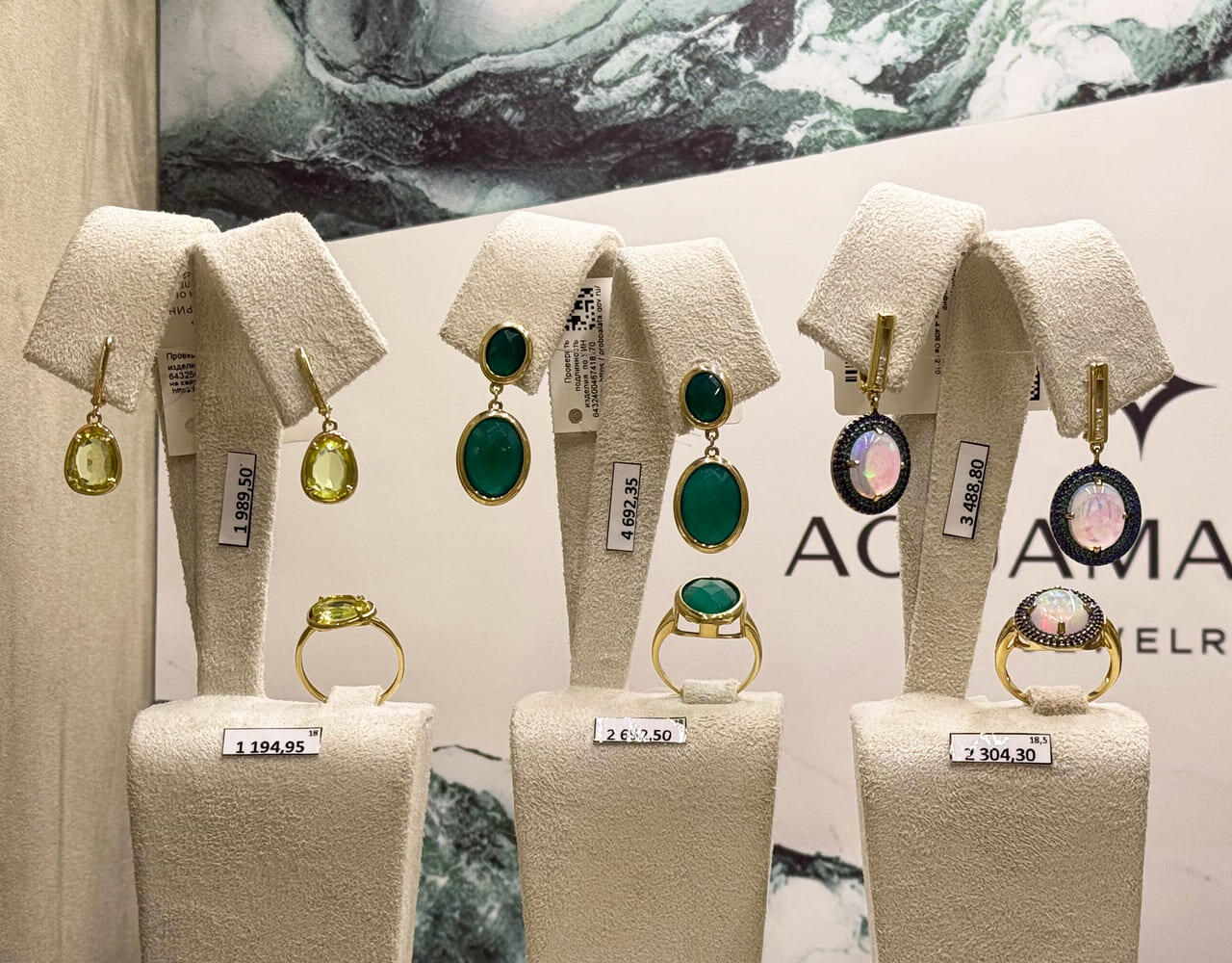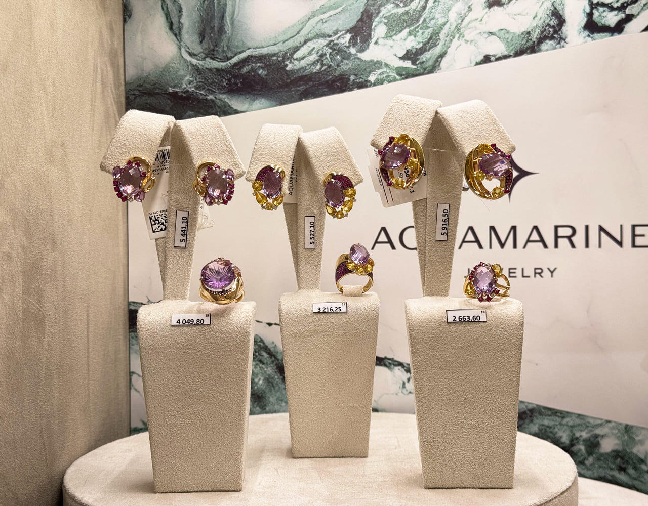 Драгоценности премиум-класса представляет бренд AQUAMARINE, который задает высокие стандарты качества и дизайна в сфере украшений. Кроме изделий с бриллиантами и яркими драгоценными камнями первой группы – изумрудами, рубинами и сапфирами, также можно примерить гарнитуры с крупными аметистами в сочетании с корундами и цитринами. Эти украшения, в силу своей фантазийности и намеренно больших размеров, станут небольшим лирическим отступлением от основного бриллиантового посыла.