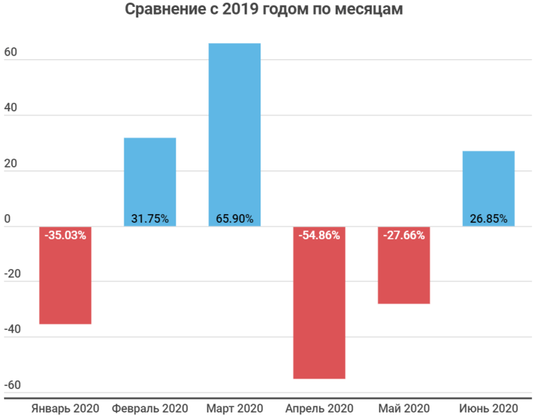 Как отметили в БАА, в марте по сравнению с тем же периодом прошлого года продажи выросли на 65,9%, а в апреле резко упали - на 54,86%. Падение продолжилось в мае, хотя и замедлилось (минус 27,66%), а в июне возобновился рост продаж (было продано на 26,85% больше авто, чем в июне 2019 года).