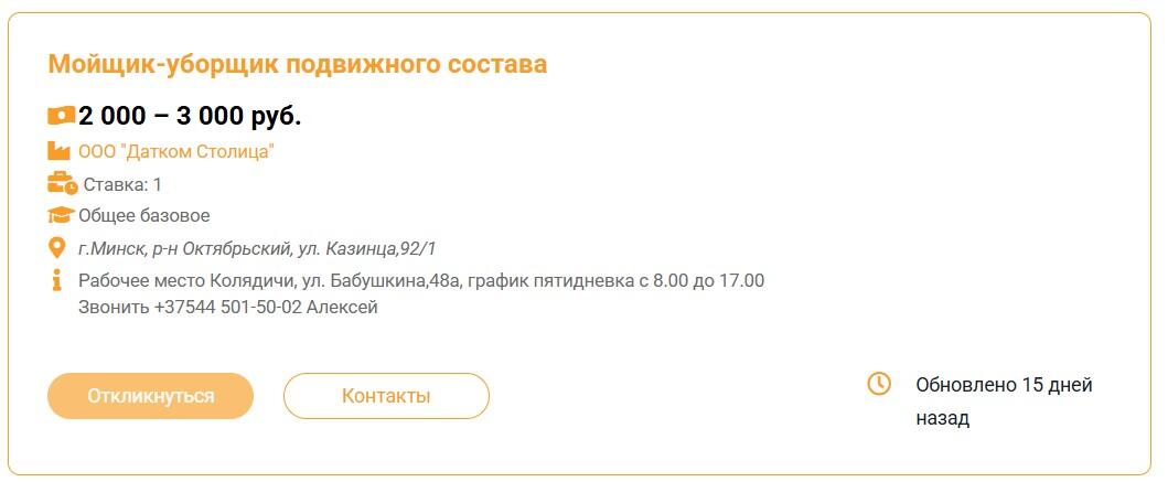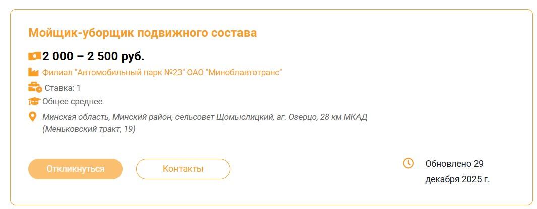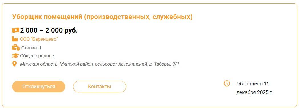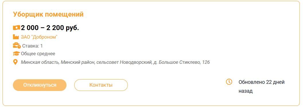Этот же наниматель ищет уборщика и в агрогородок Слобода Смолевичского района, здесь зарплата уже 1 400–1 600 BYN.