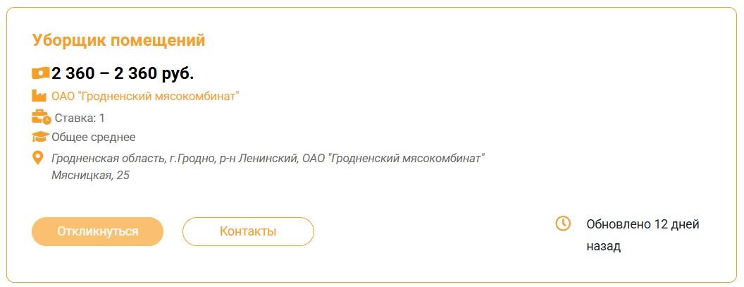 «Гродненский мясокомбинат» разместил вакансию о поиске сразу двух человек. Обещают гибкий график.