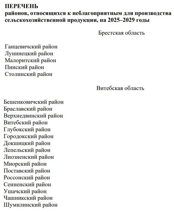 В Беларуси определены районы, относящиеся к неблагоприятным для производства сельскохозяйственной продукции на 2025–2029 гг.