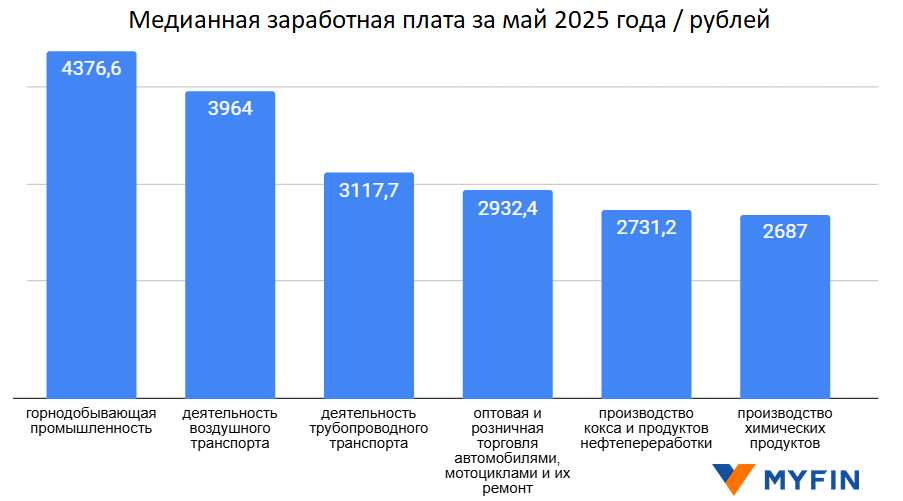 Более детальное изучение статистики показало, что самая высокая медианная зарплата за май 2025 года была в горнодобывающей промышленности (4376,6 руб.).