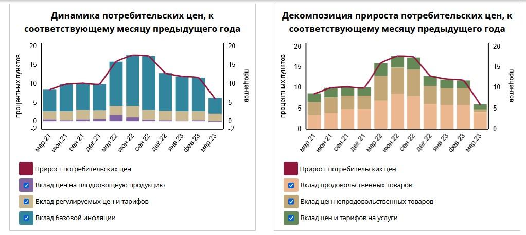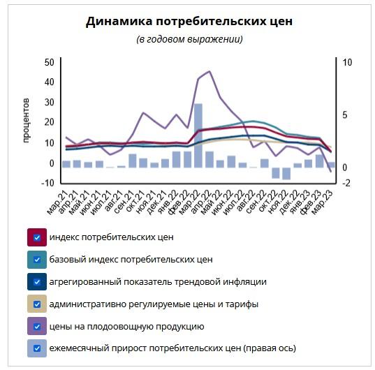 В марте годовой прирост потребительских цен снизился до однозначной величины и составил 6%.