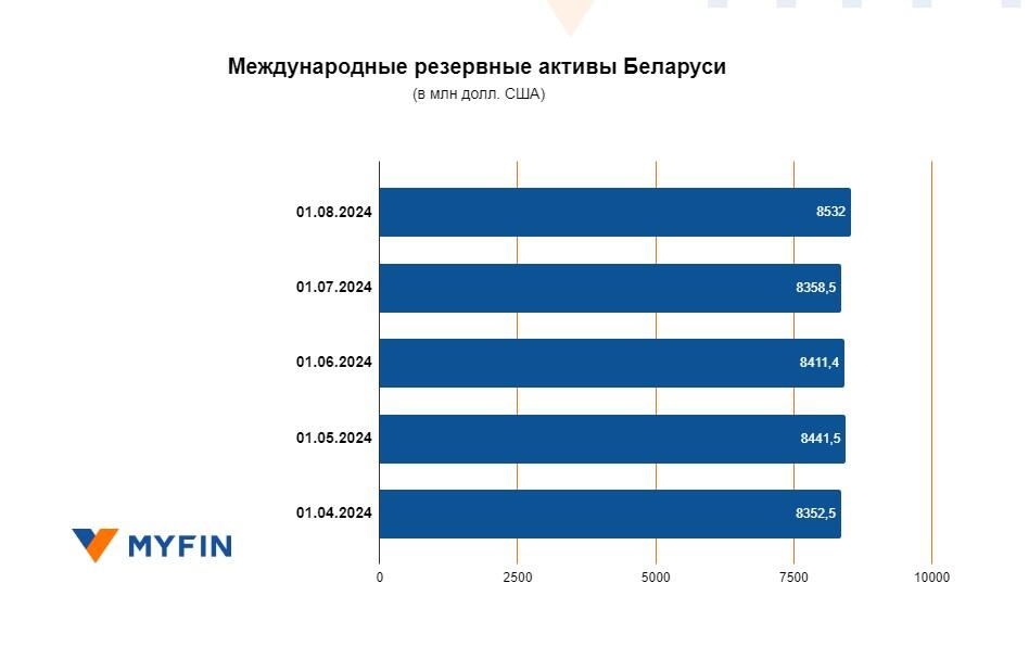 Согласно данным Нацбанка, по состоянию на 1 августа международные резервные активы Беларуси составляли $8,532 млрд.
