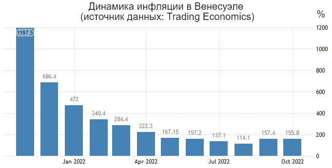 Высокой в 2022 году оставалась инфляция в Венесуэле, хотя в целом годовой прирост потребительских цен замедлился. Центральный банк Венесуэлы сообщает об уровне инфляции в 155,8% (последние доступные данные – октябрь 2022 г.).