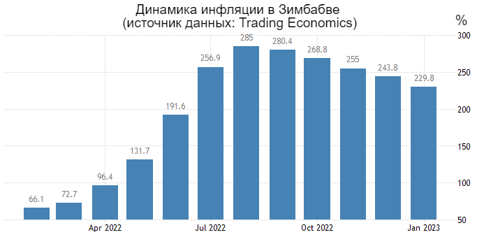 По данным Trading Economics, на текущий момент самый высокий уровень инфляции наблюдается в Зимбабве. Годовая инфляция в этой африканской стране в январе текущего года составила 229,8%.