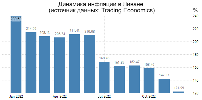 На высоком уровне также находится инфляция в Ливане. В декабре 2022 года по отношению к декабрю предыдущего года она составила 121,99%.