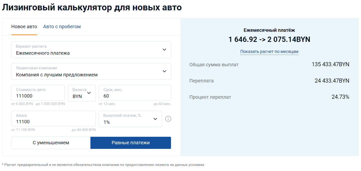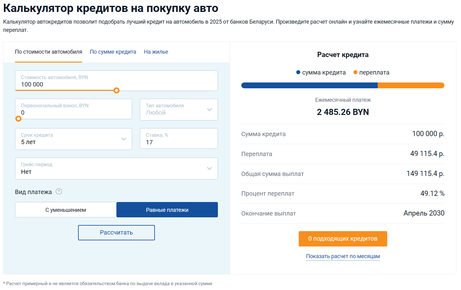 При оформлении кредита на авто ежемесячный платеж рассчитывается исходя из двух ключевых параметров – тела кредита, которое делится на количество расчетных периодов, и процентов по кредиту. Средняя годовая ставка по таким банковским продуктам составляет 16-18% годовых. С помощью кредитного калькулятора можно без труда рассчитать примерную сумму ежемесячного платежа. К примеру, автокредит на сумму в 100 000 белорусских рублей оформлен сроком на 5 лет под 17% годовых и выплачивается по аннуитетному графику без грейс-периода. Ежемесячная сумма платежа в этом случае составит чуть больше 2485 рублей, а общая сумма переплат – около 49 000 рублей.