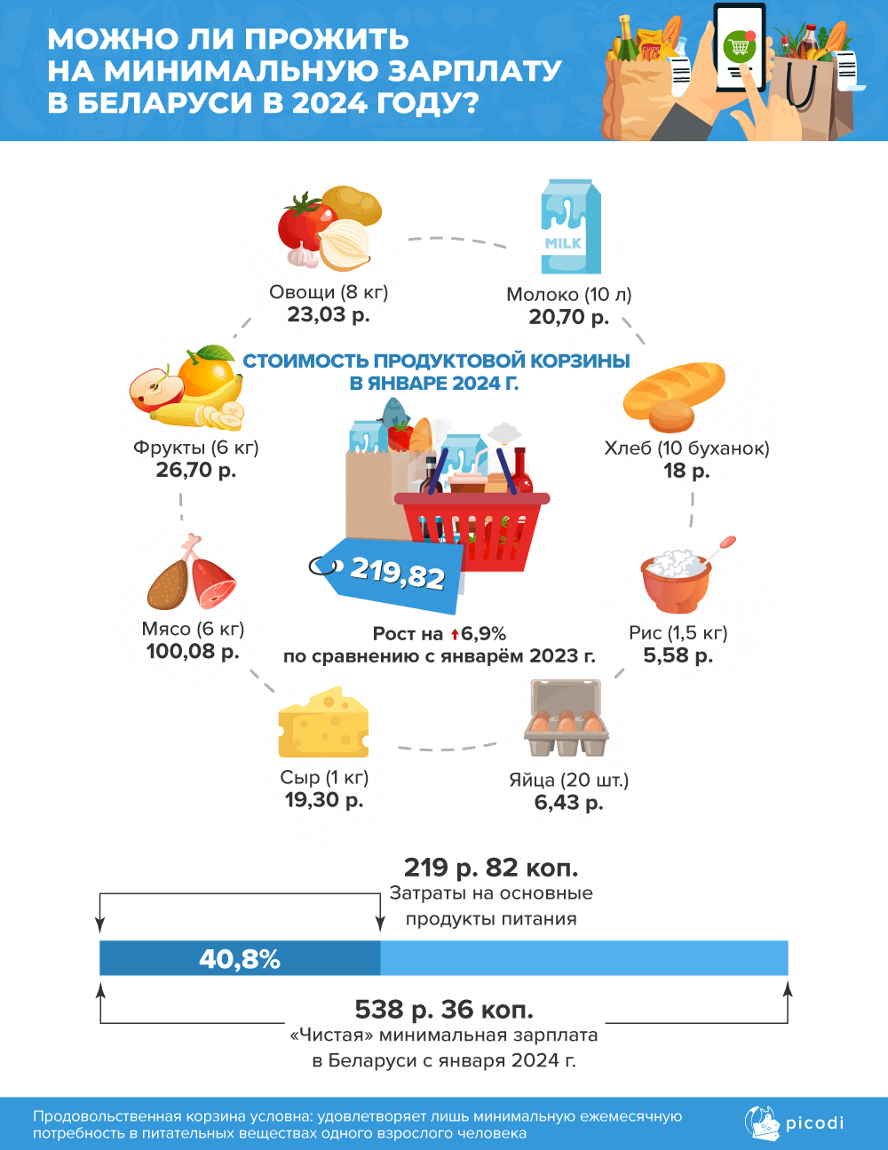 Для Беларуси стоимость урезанного продуктового набора за год выросла на 6,9% до 219,82 рубля. Также выяснилось, что на приобретение товаров из этой продуктовой корзины в нашей стране уйдет 40,8% минимальной зарплаты – годом ранее этот показатель составлял 43,1%.