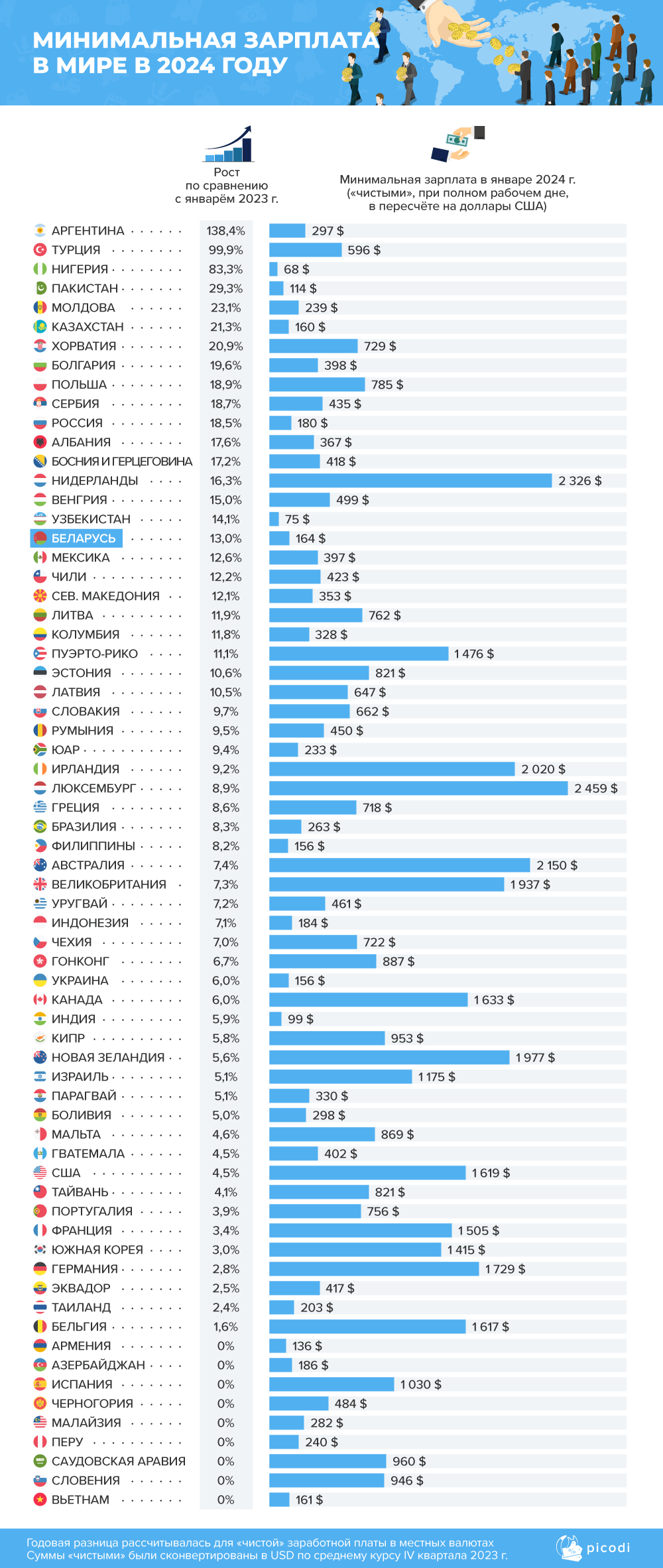 Аналитики платформы Picodi решили разобраться в том, как за последний год выросли минимальные зарплаты в 67 странах мира (в том числе в Беларуси) и насколько сильно изменилась их «покупательная способность».