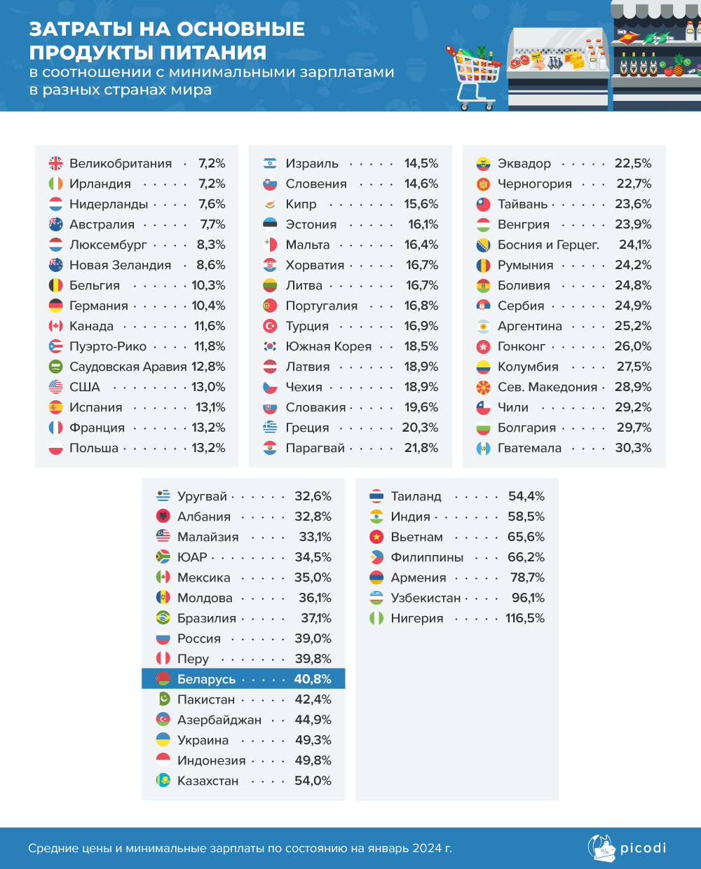Комфортнее всего на «минималку» можно прожить в Великобритании, Ирландии, Нидерландах, Австралии, Люксембурге и Новой Зеландии – во всех этих странах на упомянутые выше продукты можно потратить менее 10% от ее размера.
