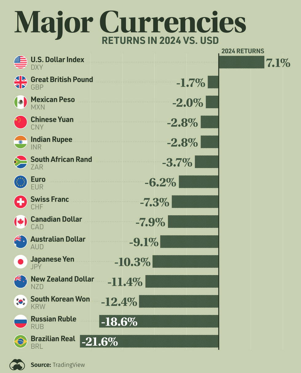 Прошедший 2024 запомнился падением даже ранее считавшимися надежными валют. Неожиданное укрепление доллара привело к тому, что в плюсе по относительной курсовой доходности оказалась только один вариант. Сравнили 15 валют разных стран по отношению к доллару. В чем было выгоднее хранить сбережения в 2024-м?