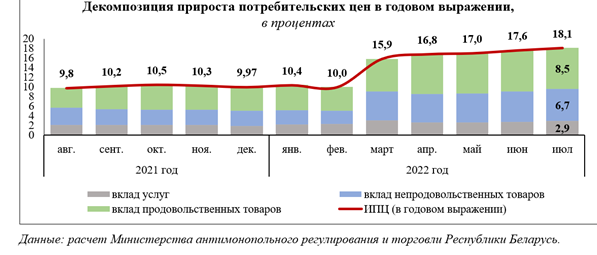 МАРТ в обзоре ценовой ситуации отмечает, что в июле годовой прирост потребительских цен составил 18,1%, по отношению к предыдущему месяцу – замедлился до 0,5% (1,1% месяцем ранее), к декабрю 2021 года – сложился на уровне 13,7%.