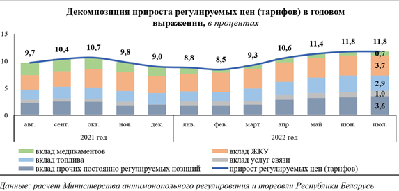 Прирост постоянно регулируемых цен (тарифов) сохранился на уровне предыдущего месяца и составил 11,8% в годовом выражении, что ниже общего уровня инфляции (18,1%).