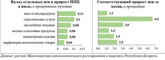 В МАРТ отметили, что в июле «в целом сохранились ценовые тенденции предыдущего месяца: значительное влияние на инфляцию по–прежнему оказало увеличение цен на туристические услуги (они подорожали на 6,6%), а также товары, которые в стране не производятся или производятся в недостаточном количестве: бытовые электротовары (на 1,8%), кондитерские изделия (на 1,9%), легковые автомобили (на 3%), парфюмерно–косметические товары (на 2,3%), синтетические моющие средства (на 4,6%)».