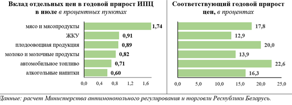В июле по сравнению с предыдущим месяцем наибольшими темпами ускорился годовой прирост цен на синтетические моющие средства (на 4,4 процентных пункта до 25,9%), чай (на 3,3 процентных пункта до 33%), обувь (на 2,3 процентных пункта до 8,9%), электротовары (на 1,2 процентных пункта до 26,9%), одежду (на 1 процентный пункт до 8,8%). Мясо и мясопродукты за прошедшие 12 месяцев подорожали на 17,8%, хлеб и изделия хлебобулочные – на 15,1%, молоко и молочные продукты – на 13,9%.