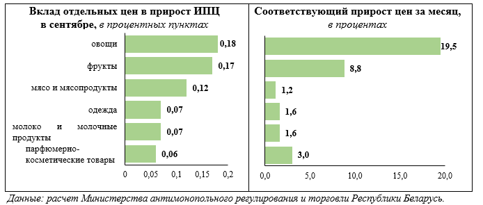 Около 40 процентов от всей инфляции за месяц обусловлено сезонным увеличением цен на овощи (на 19,5 процента к августу текущего года) и фрукты (на 8,8 процента). Наибольшими темпами увеличились в цене помидоры (в 1,7 раза), огурцы (в 2,4 раза) и капуста (на 14 процентов), однако их прирост носит восстановительный характер. Фиксируется прирост цен на бананы (на 42,1 процента) и плоды цитрусовые (на 11,2 процента).