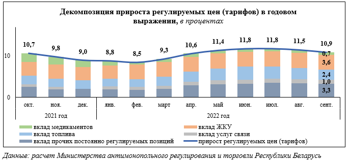 Прирост постоянно регулируемых цен (тарифов) замедлился до 10,9 процента в годовом выражении (11,5 процента в августе, 11,8 процента – в июне – июле т.г.).