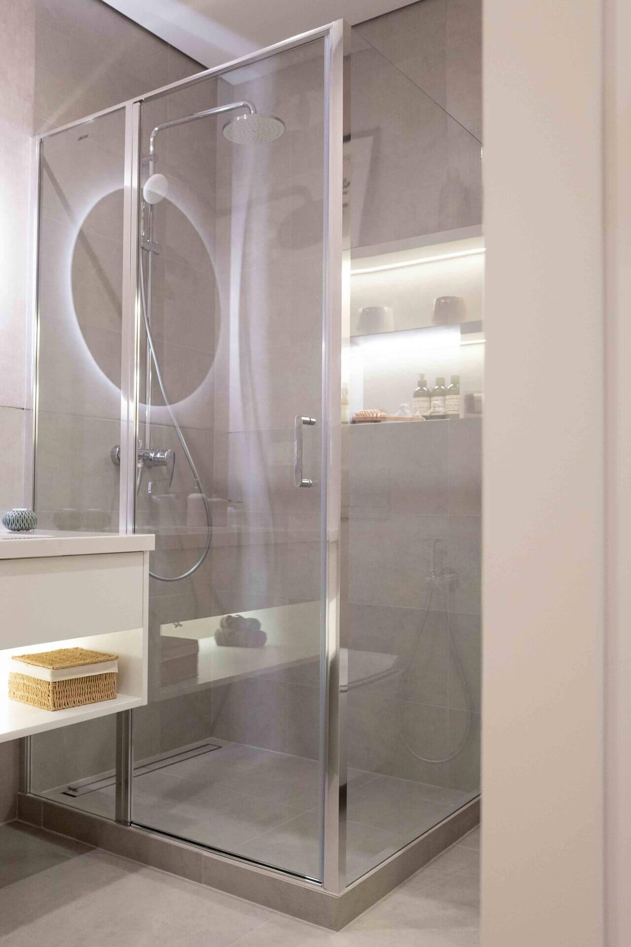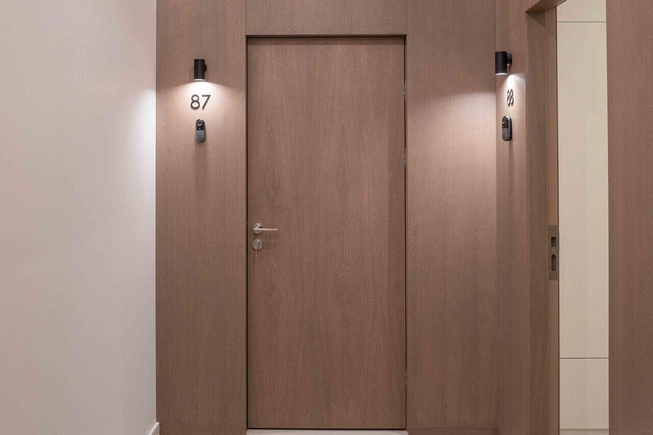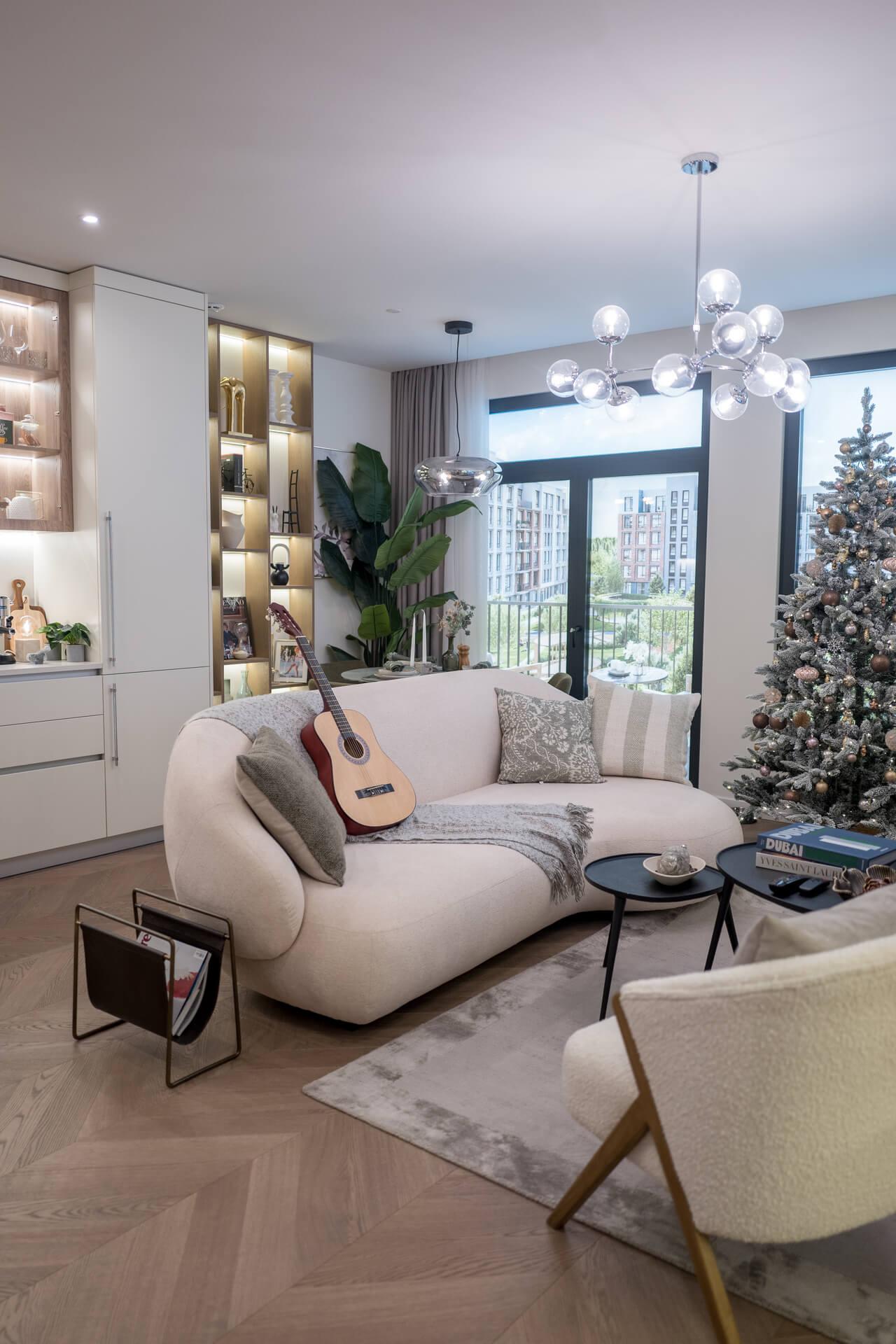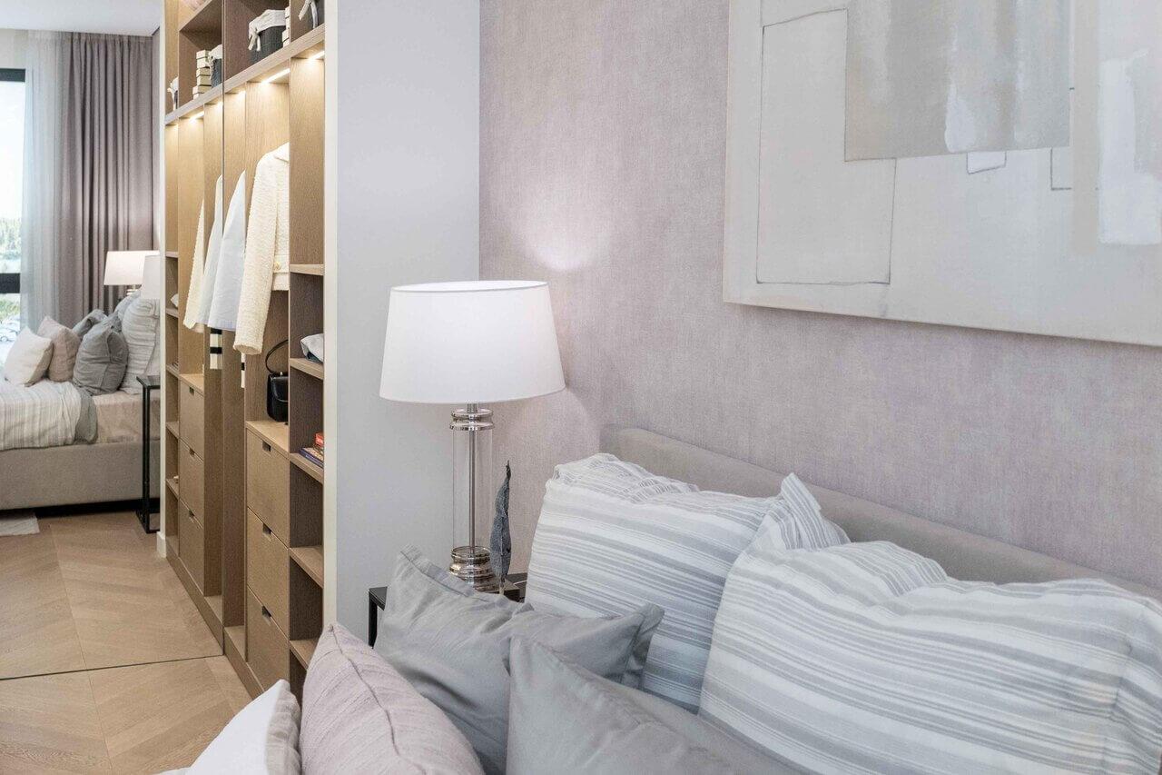 Акцент в апартаментах – на встраиваемую мебель. И такое решение используют не только в зоне кухни. По этому принципу застройщик спроектировал шкафы и двери. В квартире есть оборудованная гардеробная, постирочная комната, есть варианты с несколькими санузлами (там будет и душевая кабина, и ванная). Если вы боитесь знойного лета, то можно не переживать: кондиционер установят в каждой комнате. На стенах – краска, кухонный фартук выполнен из керамогранита. Планировка просторная, а интерьер выполнен в светлых тонах. Увидеть, как будет выглядеть ваш будущий дом, можно прямо в офисе.
