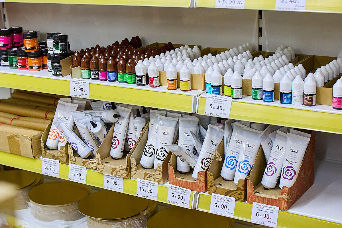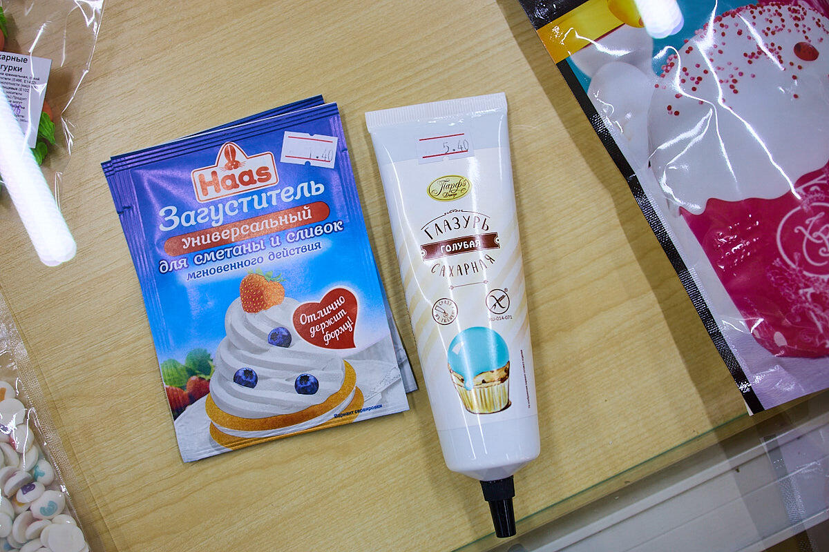 Глазурь есть готовая – 5,4 BYN за тубу или же можно взять мешочек сахарной пудры и приготовить самим. Есть даже большие объемы – 7,9 BYN за кило.