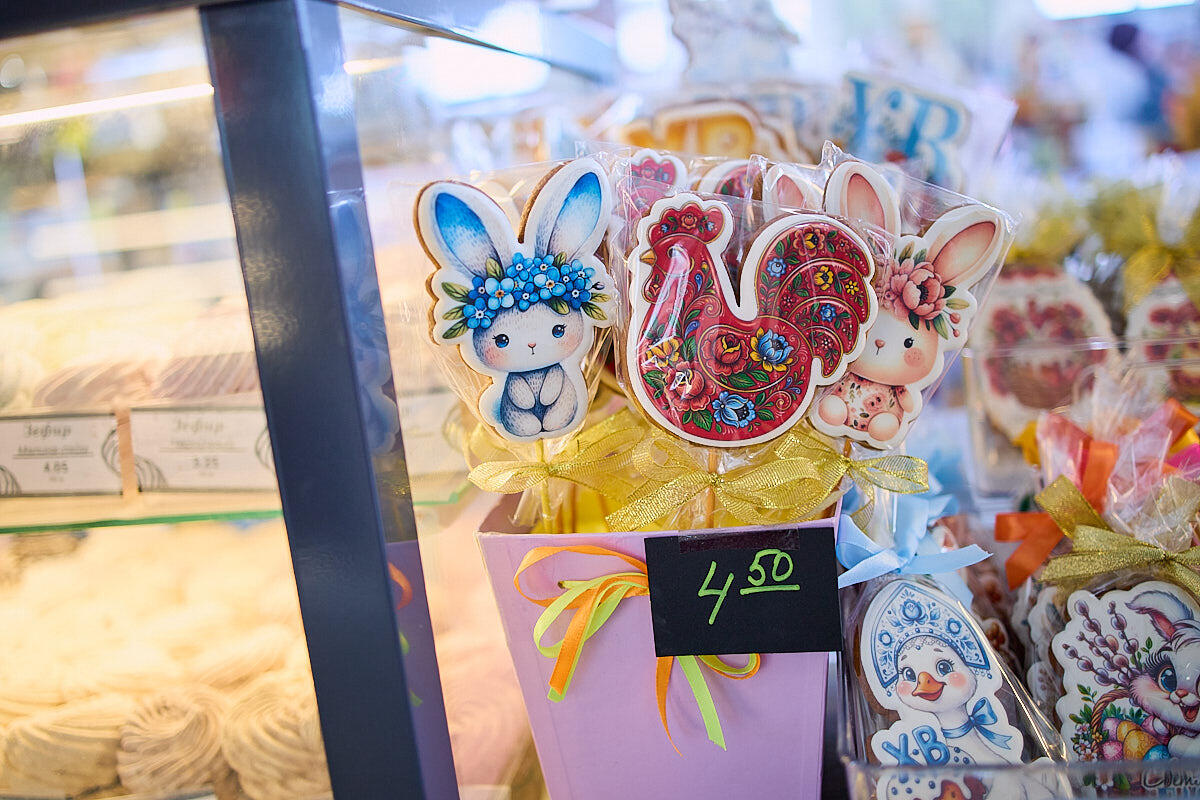 У Елены в хлебном ряду видим краффины с курагой и маком по 40 рублей, куличи по 45 рублей – внутри апельсиновые цукаты и изюм, и детские куличики за 12 рублей – уменьшенного размера, с заячьими ушками и без изюма, для самых взыскательных. А еще любопытная сладость – зефир по 7 BYN под куполом.