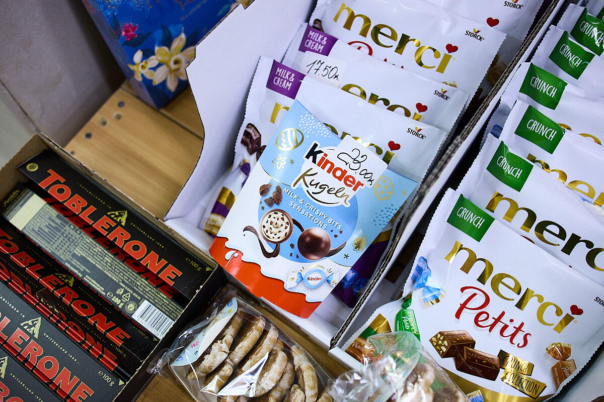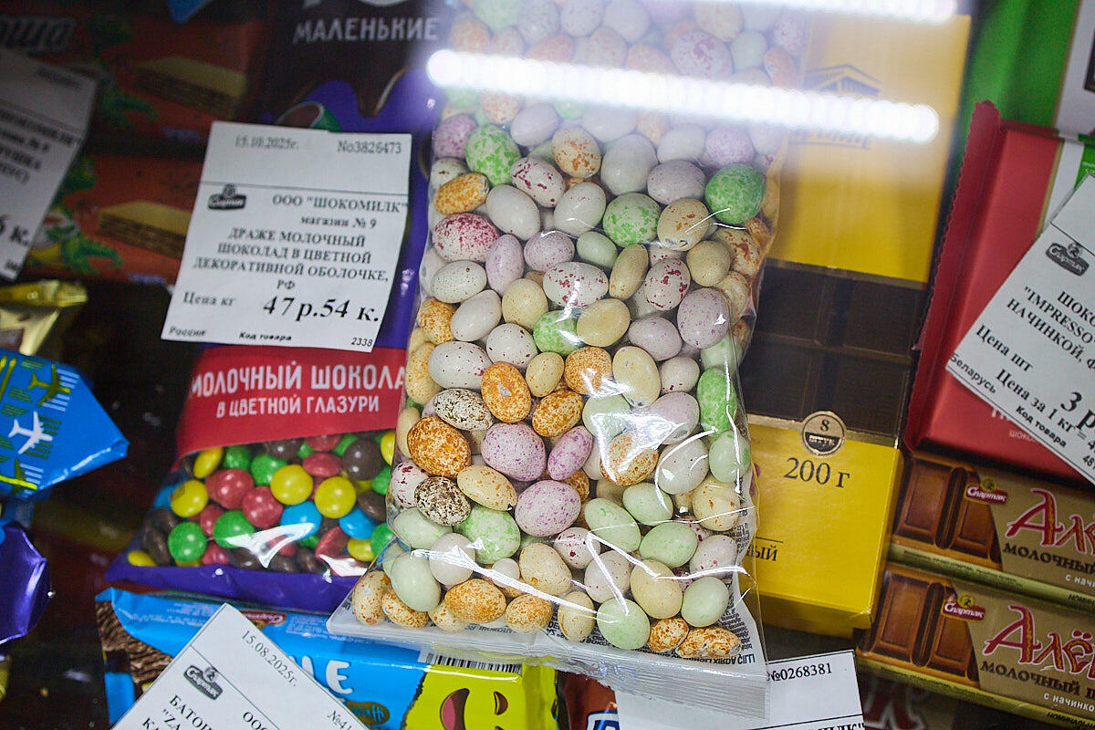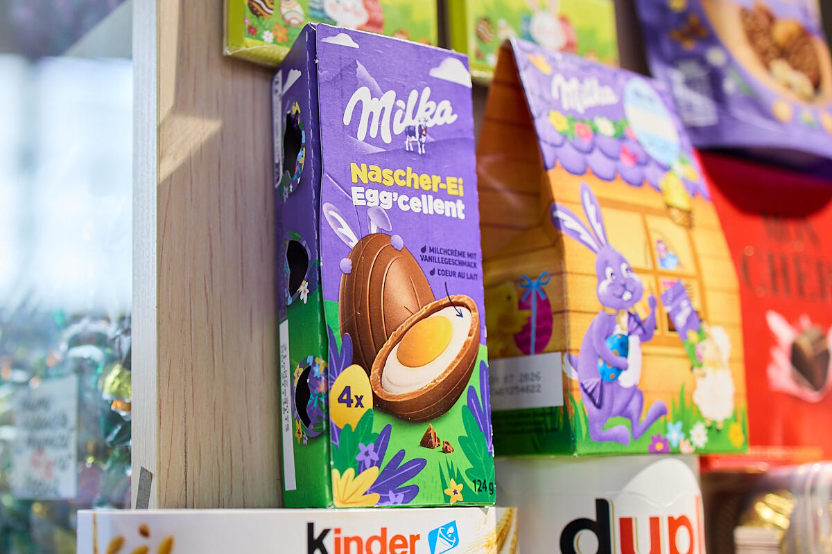 В магазине рядом с хлебами – набор больших яиц Milka по 14 рублей, там же – крупные «Киндеры» по 35 BYN, шоколадные яйца из Польши за 68 BYN/кило и шоколадные яйца для украшений – 15–16 рублей в зависимости от производителя и упаковки.
