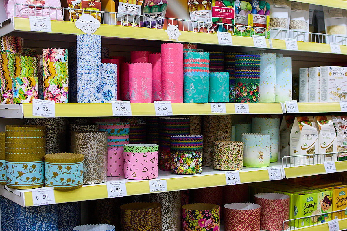 Идем дальше – выпечка! Если вам нужны формочки для куличей, глазурь, украшения, посыпка – всё это есть в крупном магазине «Хлеб дома».