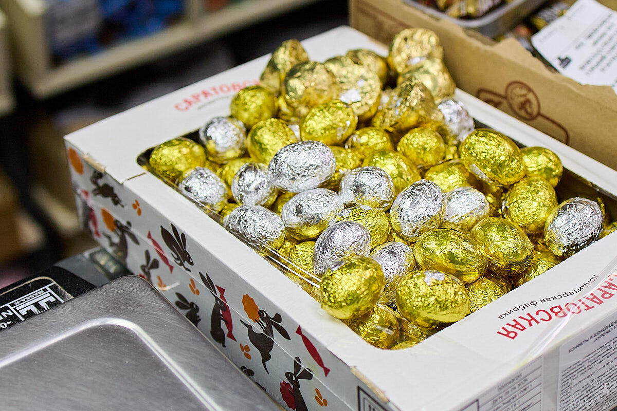 В «Спартаке» тоже есть что купить: шоколадные яйца для украшения, а еще – цельные, не полые шоколадные яйца с двумя начинками на выбор – арахис или яичный ликер.