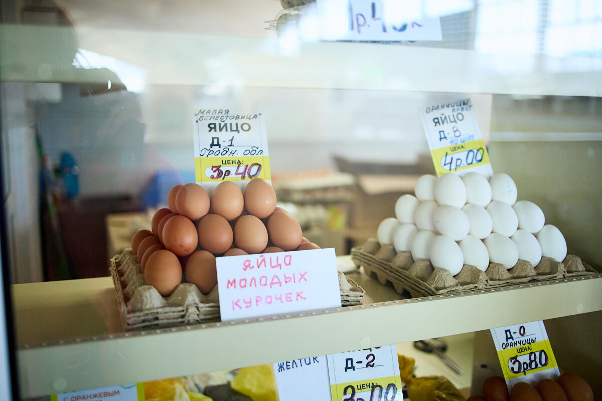 Магазинов много: Солигорские, Кобринские, Оршанские, фермерские – все здесь. Цены приятные: средняя стартовая – 3 рубля за десяток, яйца Д-0 продают за 3,6–3,8 BYN, Д-В – 3,8–4 BYN.