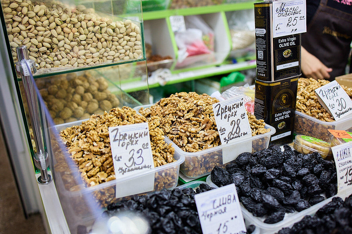 Тут цены могут отличаться сильно в зависимости от поставщиков и свойств сухофруктов. Продавец Елена проводит экскурсию по полкам. Приводим цены за 100 граммов: популярная сейчас клюква – 3,35 BYN, цукаты – 1,95 BYN, грецкий орех – 3,55 BYN, миндаль – 5,95 BYN. Для декора есть и лепестки миндаля по 7,55 BYN за 100 г.