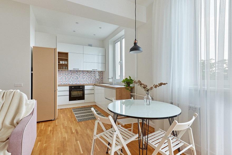 Двухкомнатная квартира по индивидуальному дизайнерскому проекту, где совместили кухню с гостиной, а спальню отделили прозрачными перегородками со шторами. Пространство здесь выдержано в светлых тонах, рабочая зона на кухне обустроена у окна, вся мебель встроена.
