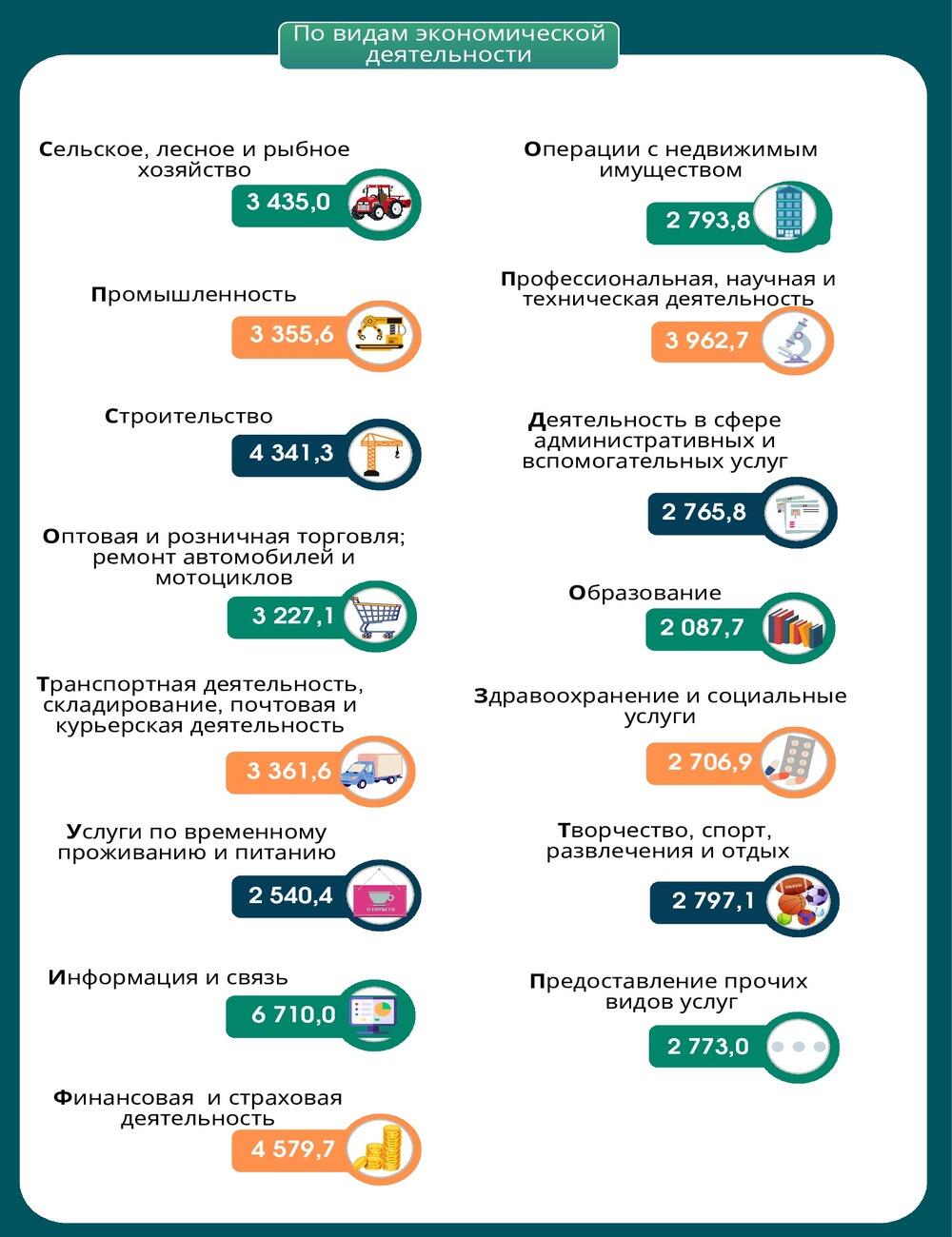 Далее идут финансовая и страховая деятельность (4579,7 руб.), строительство (4341,3 руб.), профессиональная, научная и техническая деятельность (3962,7 руб.).