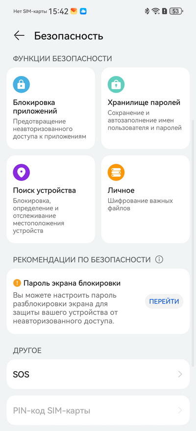 Другие системы безопасности связаны уже с фирменной оболочкой EMUI 14.2, под управлением которой работает Huawei Pura 70. Одна из них – это Центр безопасности, который располагает встроенным антивирусом и если защита устройства включена, то он периодически проверяет систему на наличие вирусов, блокирует нежелательное содержимое, выполняет сканирование сети и определяет вредоносные приложения. Здесь можно найти такие функции как «Блокировка приложений», «Хранилище паролей», «Поиск устройства» и «Личное».