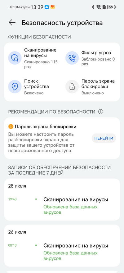 Еще центр безопасности умеет давать рекомендации по защите устройства. Например, если вы забыли настроить хотя бы просто пароль разблокировки экрана, то он об этом напомнит.