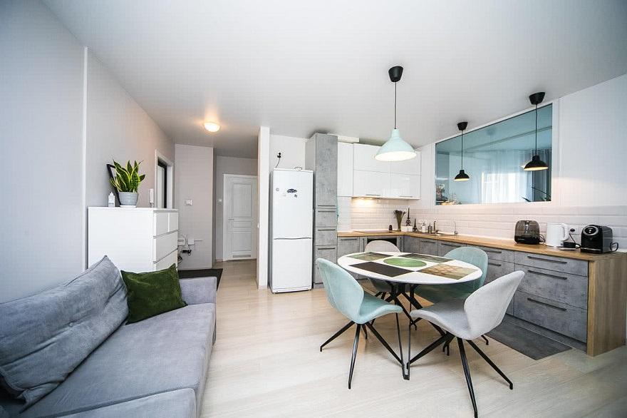 Просторная двухкомнатная квартира со старым лесопарком за домом и музеем валунов с огромной зеленой зоной через дорогу. В квартире 70 квадратных метров, хотя она двухкомнатная. Дому только 5 лет, поэтому отделка в квартире практически свежая: натяжные потолки, влагостойкие немецкие обои и плитка на стенах, высокопрочный ламинат и керамическая плитка на полу.