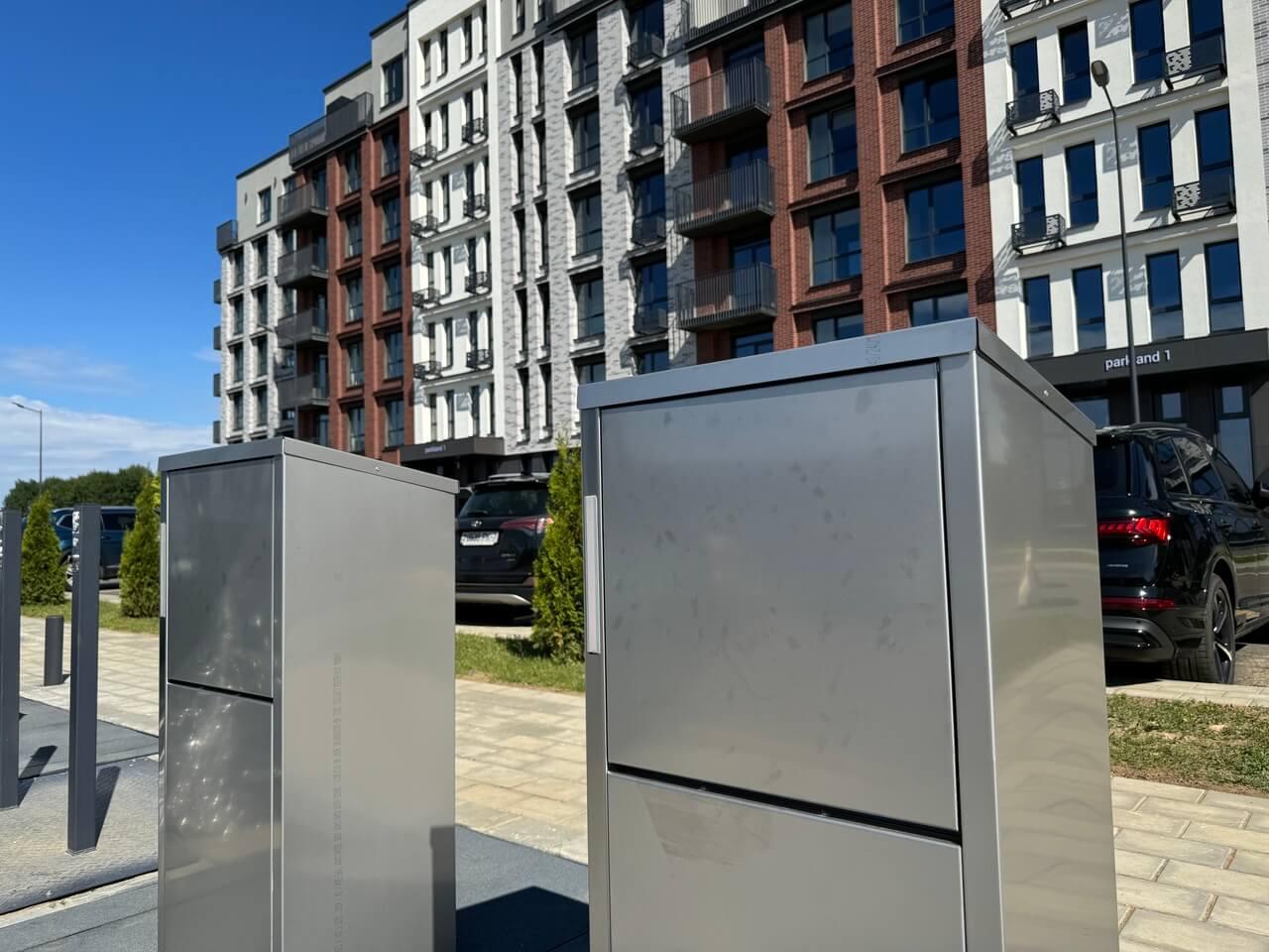 Отходы утилизируют инновационным способом: действует подземная система для сбора мусора. Для этого во дворе оборудованы футуристические островки из металла, которые выполняют роль мусоропровода.
