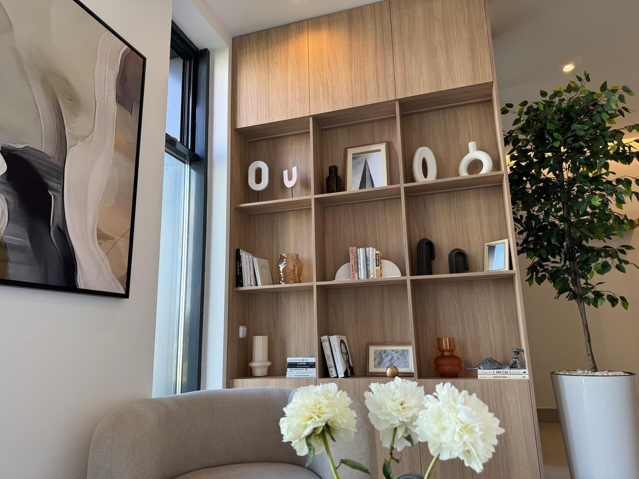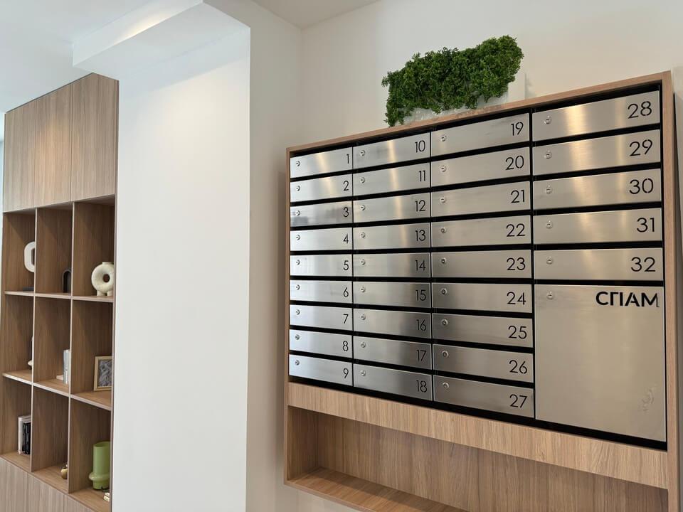 Особым уютом дом наполняют приятные мелочи: стильные почтовые ящики, декор и даже ароматизатор. В едином стиле выполнены лестничные пролеты, установлены одинаковые входные двери с отделкой HPL-панелями. В лобби находится небольшая библиотека, помещение для хранения колясок и душ для четверолапых питомцев – лапомойка.