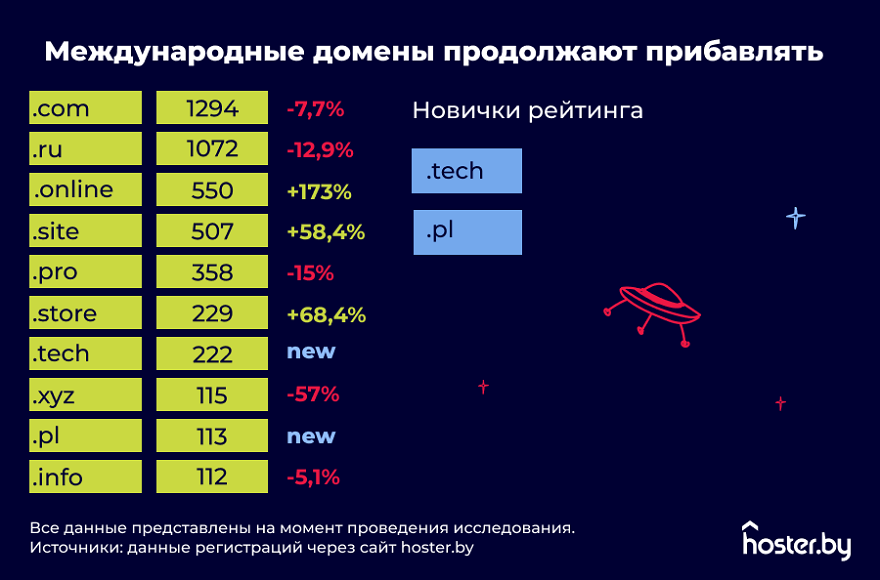 Более того, по словам Повалишева, в целом в Европе наметилась тенденция, когда пользователи начинают отдавать предпочтение международным доменным именам, нежели национальным зонам. При этом белорусские пользователи последние два года все реже выбирают зоны .com и .ru, в прошлом году в десятку самых популярных среди белорусов вышли домены .pl и .tech, а домен .online вообще продемонстрировал рекордный рост.